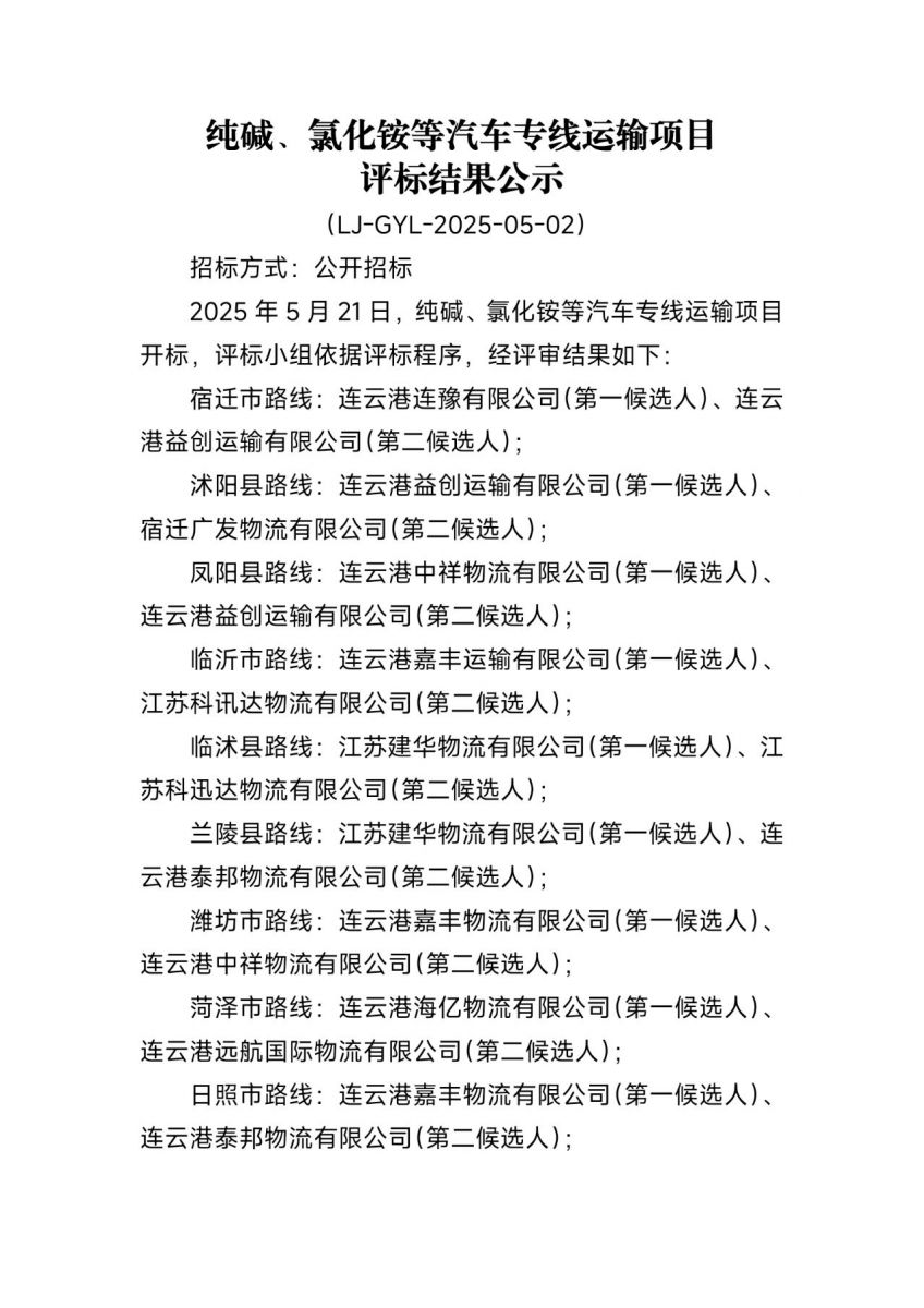 連云港連堿供應鏈有限公司純堿、氯化銨等汽車專線運輸項目評標結果公示