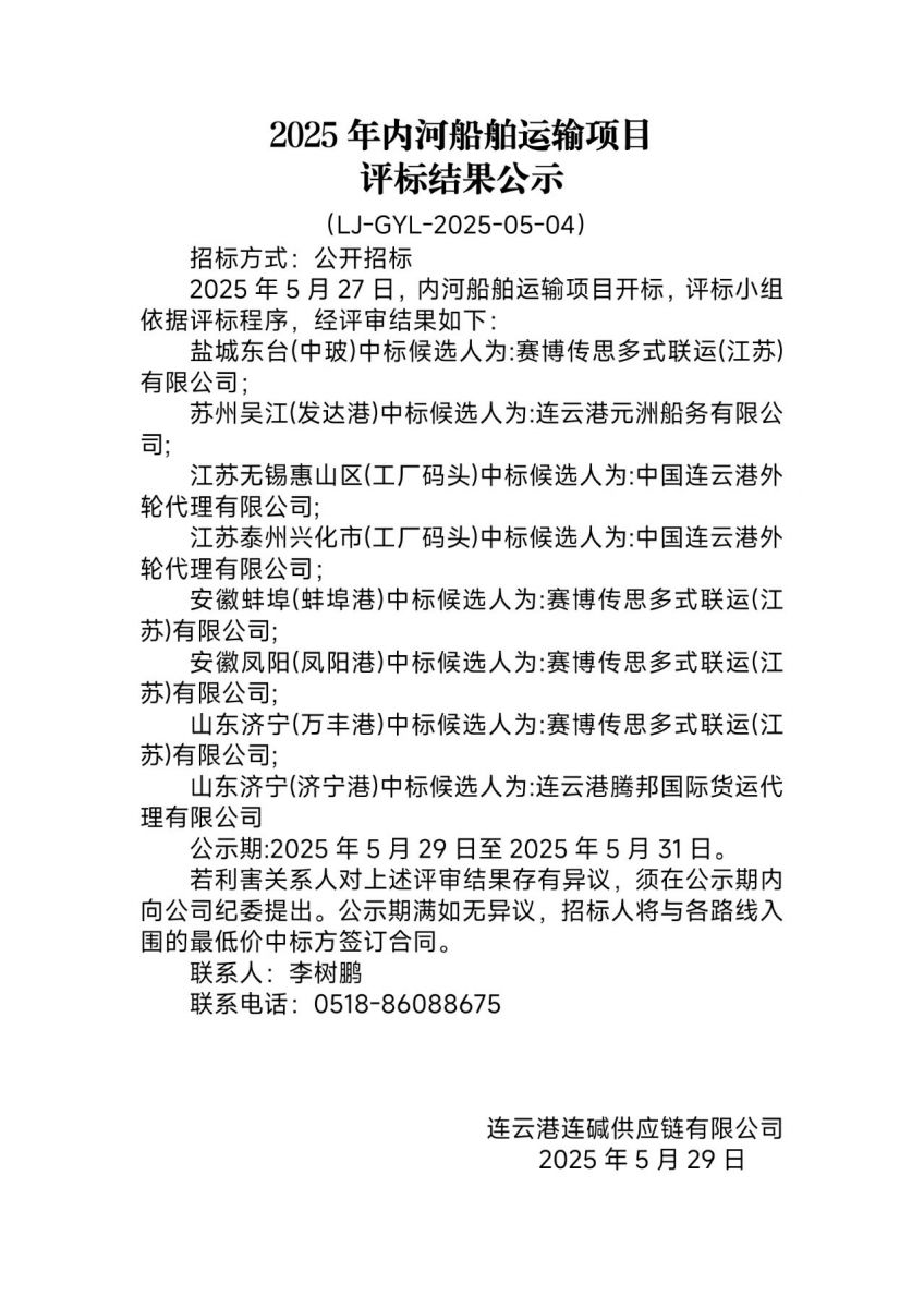 連云港連堿供應(yīng)鏈有限公司2025年內(nèi)河船舶運輸項目評標結(jié)果公示