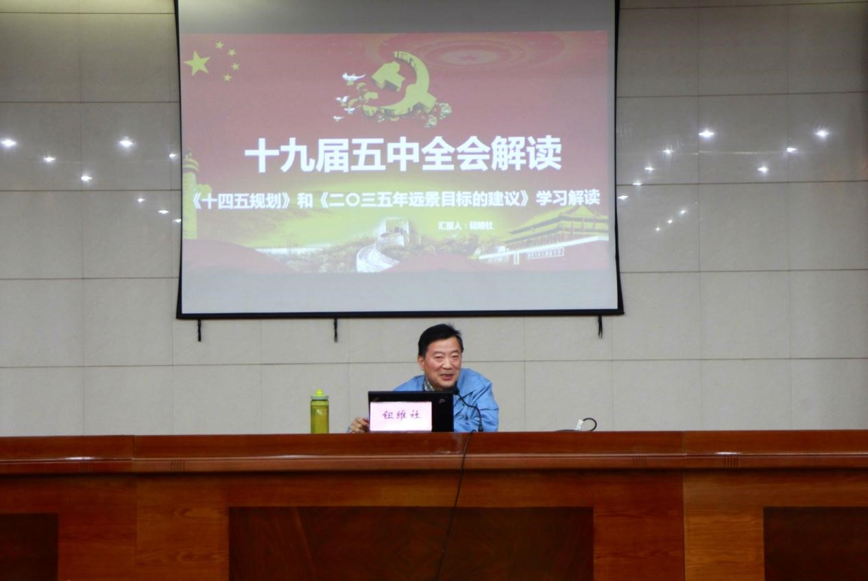 會上,鈕維社從“十九屆五中全會簡介”、“全會召開的背景和意義”、“回眸與展望”、“二0三五年遠(yuǎn)景目標(biāo)”、“十四五規(guī)劃”五個方面,結(jié)合具體事例,用通俗易懂的語言進(jìn)行了全面準(zhǔn)確的闡述,對我們認(rèn)真領(lǐng)會、準(zhǔn)確把握十九屆五中全會精神實質(zhì)具有十分重要的意義。