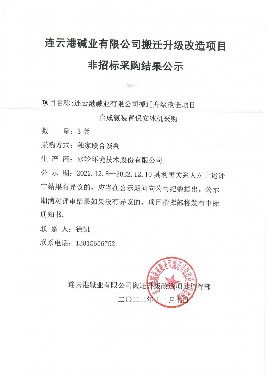 合成氨裝置保安冰機(jī)非招標(biāo)采購(gòu)結(jié)果公示