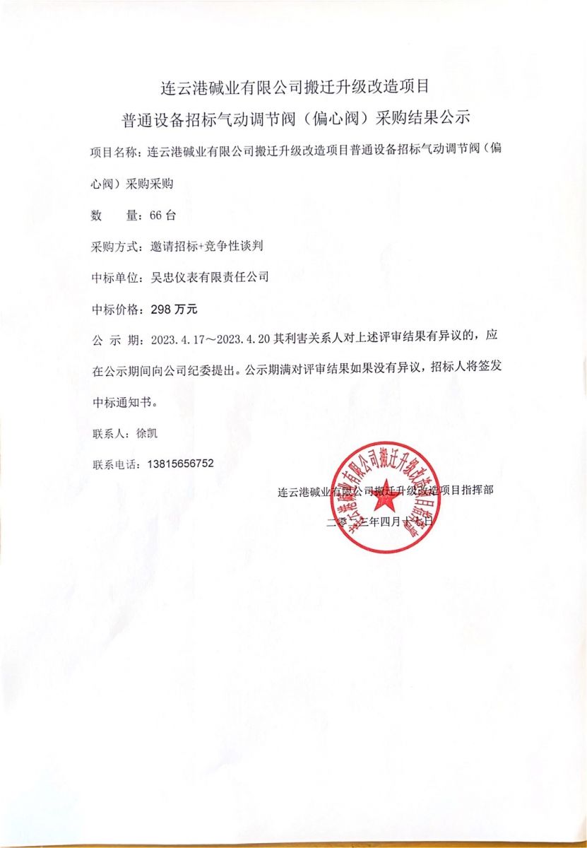 氣動調節(jié)閥(偏心閥)采購結果公示