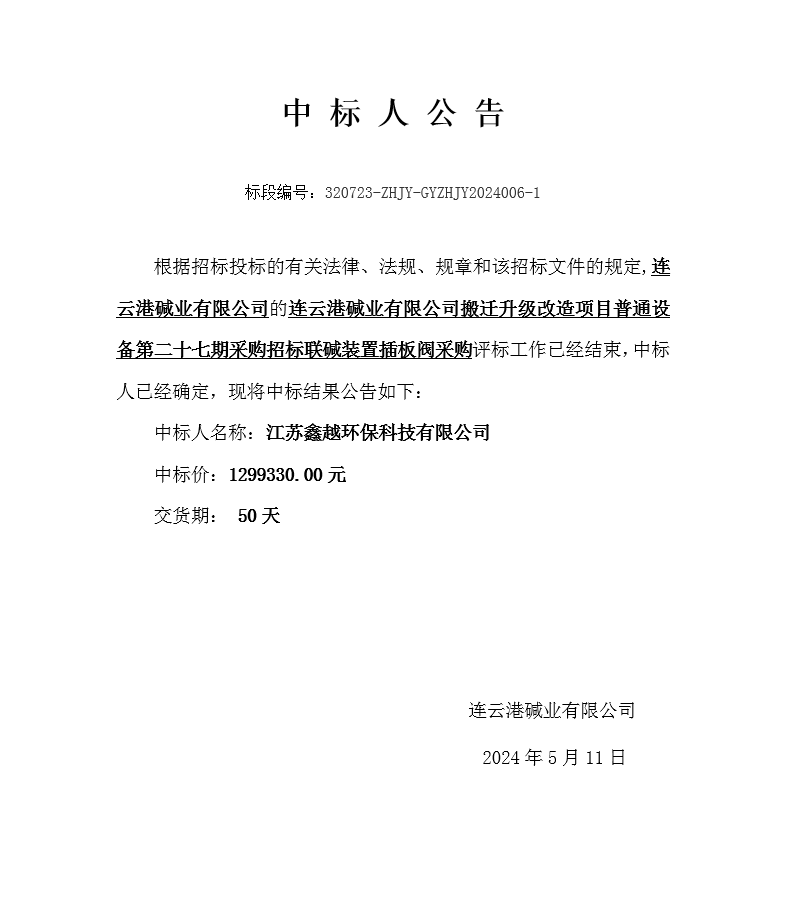 搬遷升級改造項(xiàng)目普通設(shè)備第二十七期采購招標(biāo)聯(lián)堿裝置插板閥采購中標(biāo)人公告